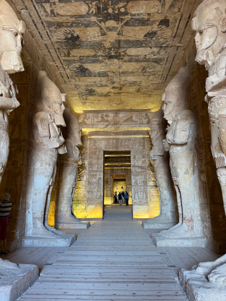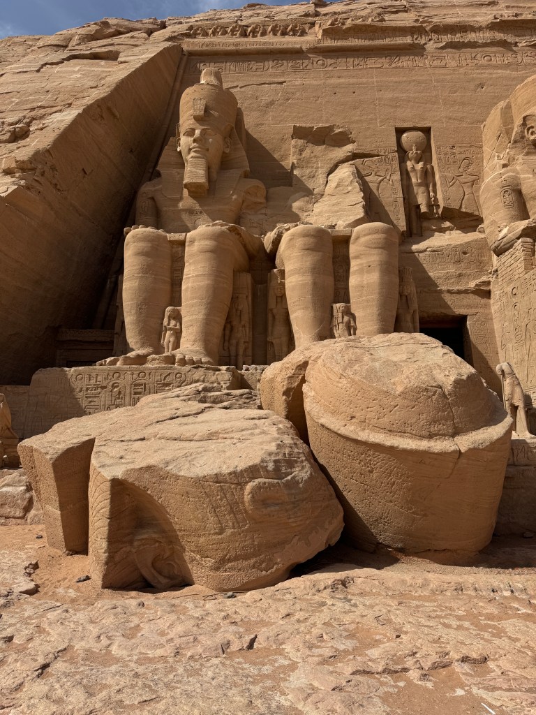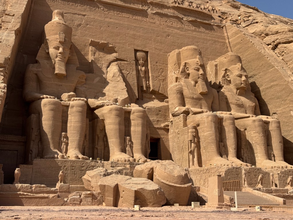 Douglas and Patricia Yeo at Abu Simbel. We are close to the statues of Ramesses II; you can see just how huge they are. These seated statues are 65 feet tall; by contrast, the monumental standing statue of Ramesses II in the courtyard of the Grand Egyptian Museum (shown earlier) is 36 feet tall. If the Abu Simbel statues were standing, they would be about 125 feet tall – the height of a 10–11 story building and taller than the Statue of Liberty (without its pedestal).
