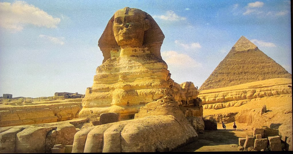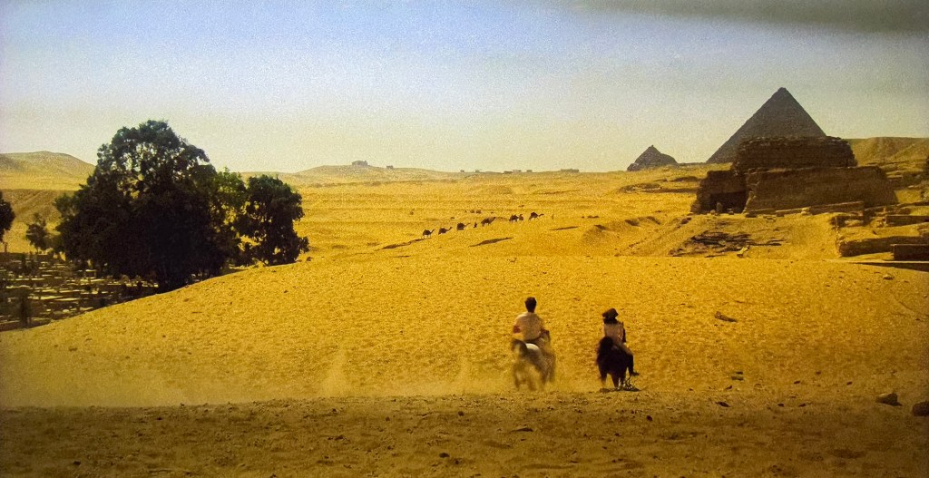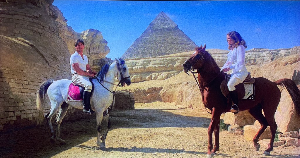 One night, the 1978 movie adaptation of Agatha Christie’s Death on the Nile was shown on board the ship. We watched it and then watched it again when we got home. It was so fun to view the movie – much of which was shot on location in Egypt at the Pyramids and Sphinx, Karnak, and Abu Simbel – knowing so much about the sites. And this was funny: In a scene early in the movie, Linnet Ridgeway-Doyle (played by Lois Chiles) and her husband, Simon Doyle (played by Simon MacCorkindale) ride horses from the Pyramids to the Sphinx. They stop at the Sphinx and then continue riding away. Only if you’ve been to Egypt will you laugh at the impossibility of the scene: After riding FROM the pyramids to the Sphinx, they continue riding off AWAY from the pyramids. But the pyramids are in front of them! Have a look at the sequence below. We still don’t know exactly how ancient Egyptians built the Pyramids. But Hollywood figured out how to move them!