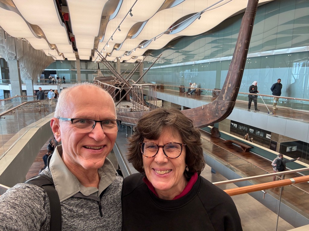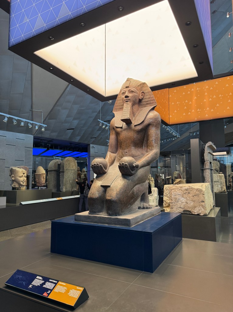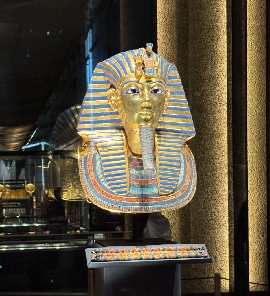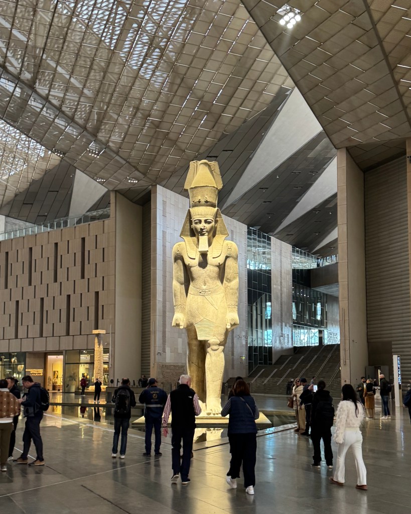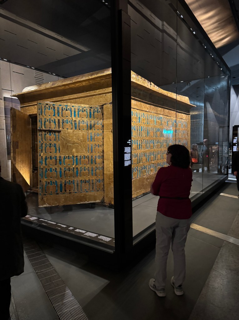 Pat and I decided to go to Egypt a day earlier than the group so we could have an extra day to explore the Grand Egyptian Museum (GEM). We’re so glad we did. Years in the planning, the museum had a soft opening a few years ago but the most remarkable of its galleries – the ones with all 5,000+ treasures from the tomb of Pharaoh Tutankhamun, were not yet open. That had to wait for the grand opening of the museum that was delayed multiple times. Happily, the museum fully opened in November 2025, in time for us to visit.
