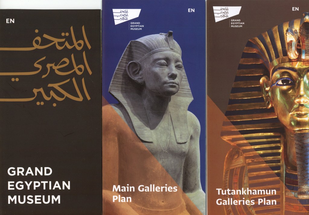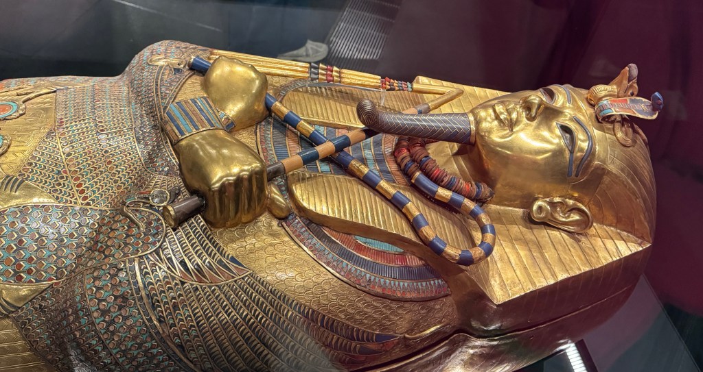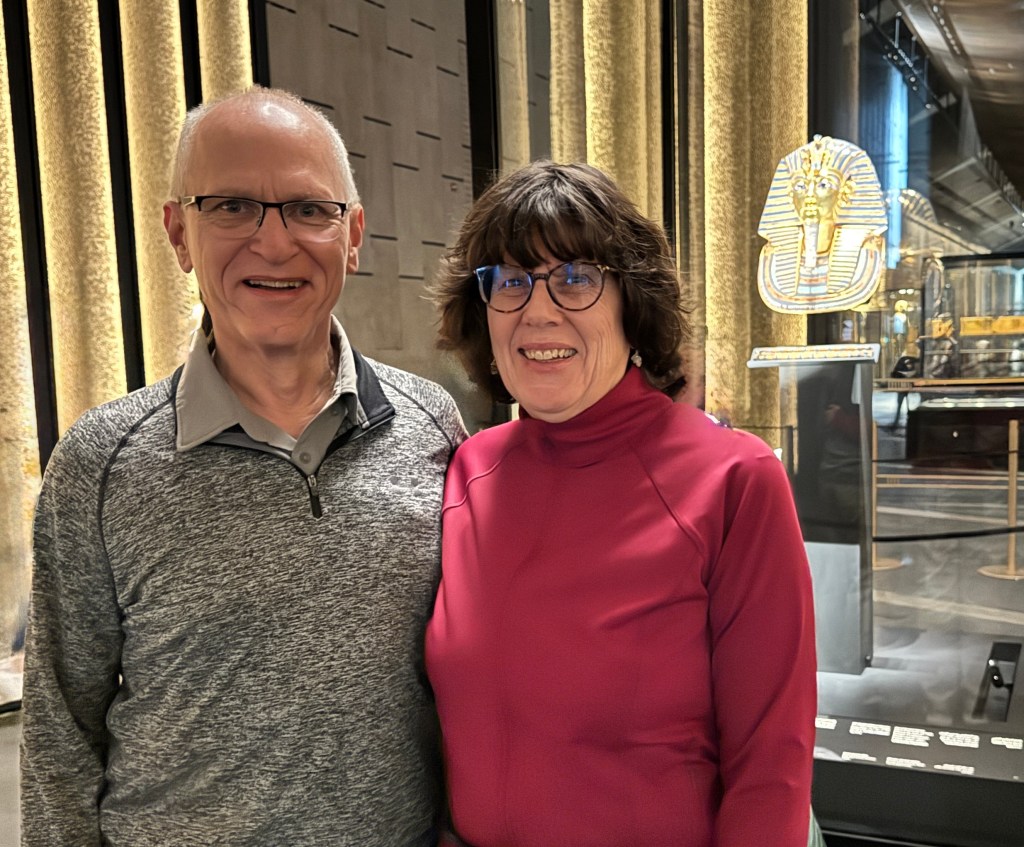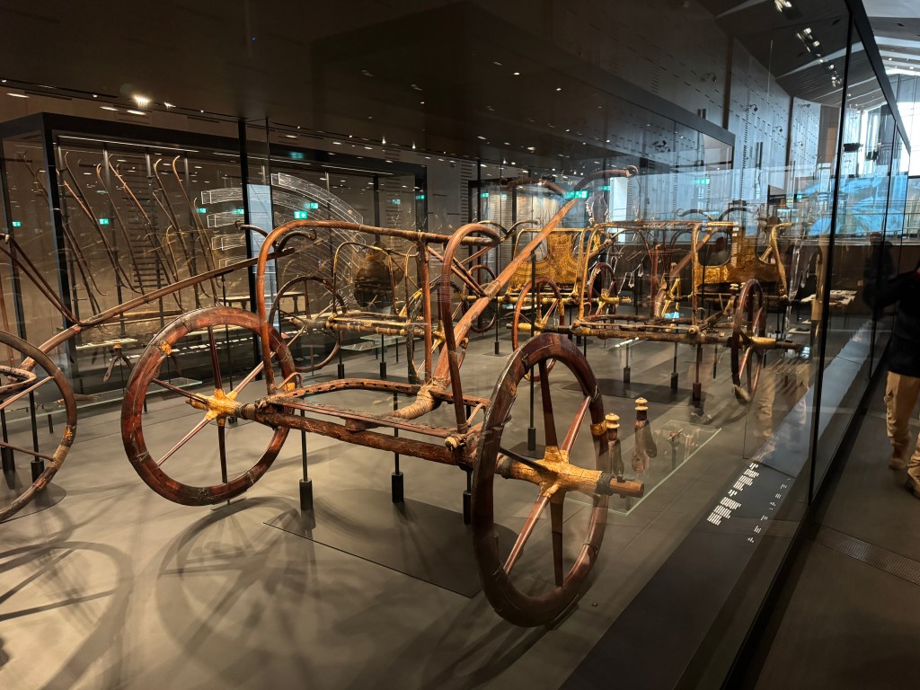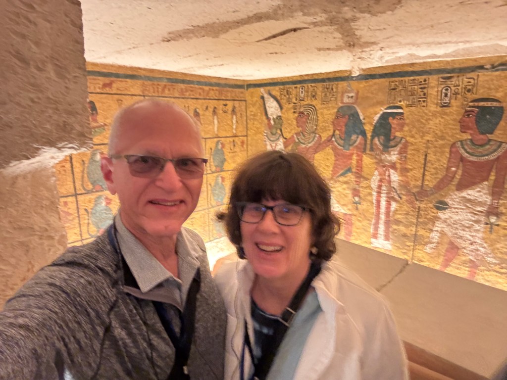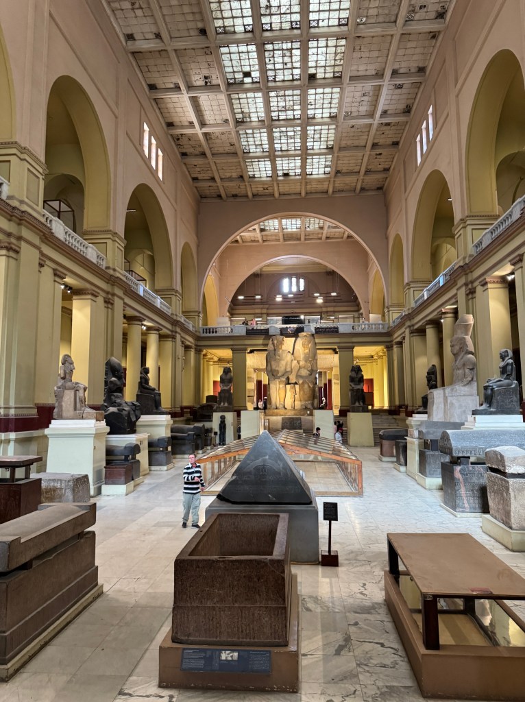 Pat and I decided to go to Egypt a day earlier than the group so we could have an extra day to explore the Grand Egyptian Museum (GEM). We’re so glad we did. Years in the planning, the museum had a soft opening a few years ago but the most remarkable of its galleries – the ones with all 5,000+ treasures from the tomb of Pharaoh Tutankhamun, were not yet open. That had to wait for the grand opening of the museum that was delayed multiple times. Happily, the museum fully opened in November 2025, in time for us to visit.