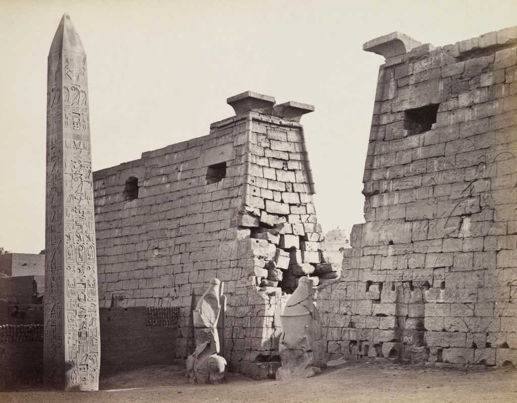 Luxor Temple entry pylon and obelisk by Francis Frith, c. 1858. Note how the sand has covered the statues at the gate up to their shoulders.