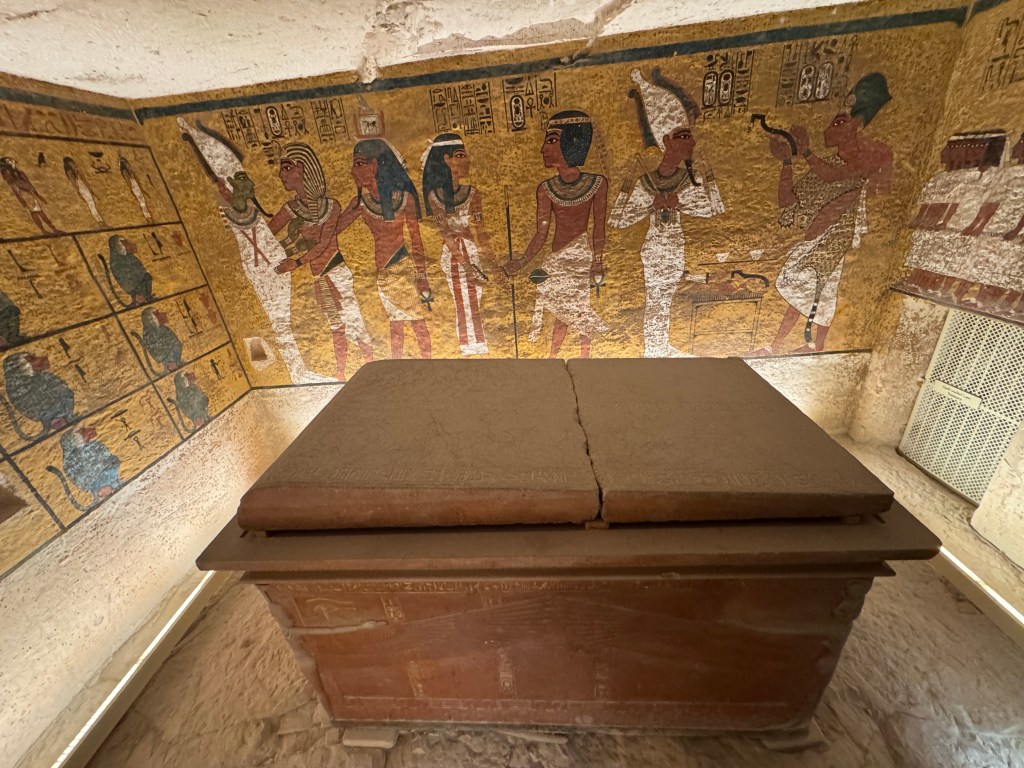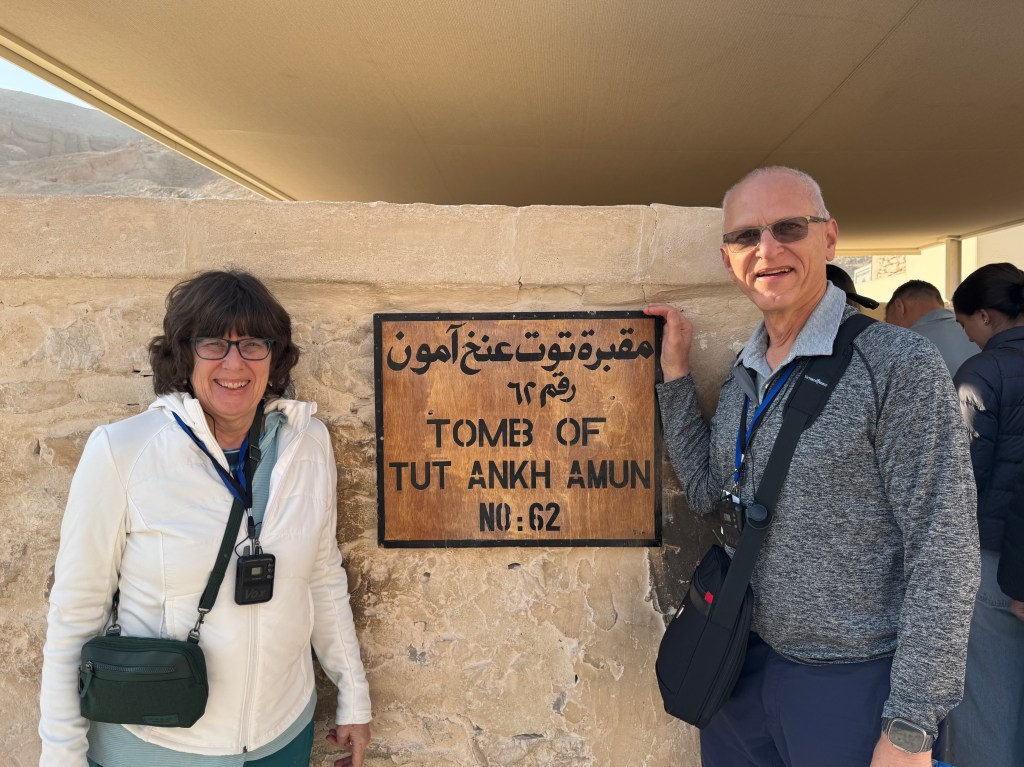 From Luxor, we traveled to the Valley of the Kings and Valley of the Queens. The highlight of this excursion was seeing the tomb of Tutankhamun. Having seen the treasures from his tomb at the Grand Egyptian Museum in Giza, seeing his tomb – and seeing how small it was – was enlightening. Tutankhamun’s mummy and his granite sarcophagus are still in the tomb, along with the brightly painted walls. Having read many books about Tutankhamun and his treasures, seeing his tomb in person gave us a memorable, unique perspective.