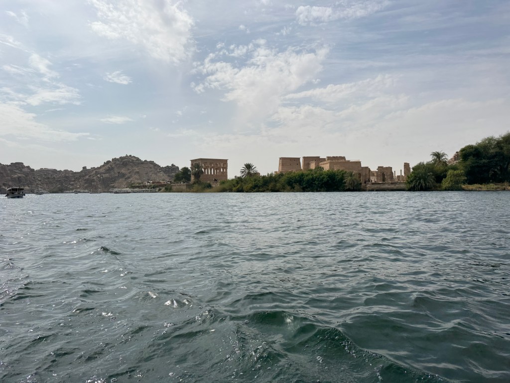Philae from the boat. The temple was moved from Philae Island to nearby Agilkia Island when the temple was threatened by water with the construction of the Aswan High Dam.