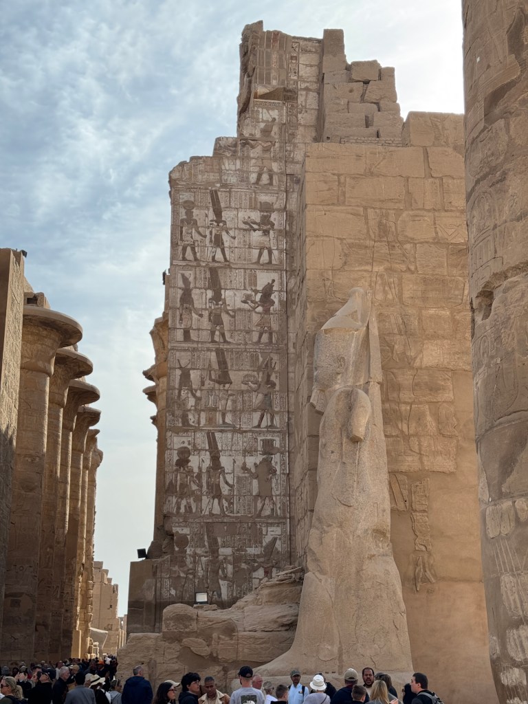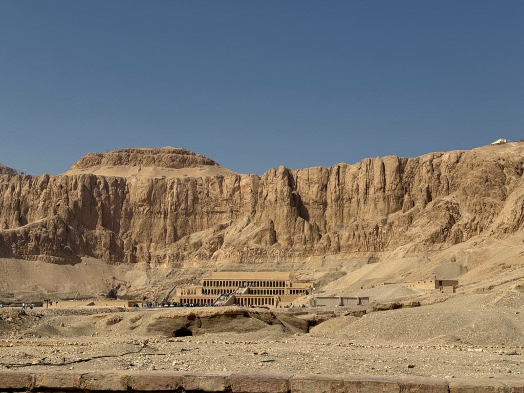 The Mortuary Temple (Deir Al Bahari) of Queen Hatshepsut – who ruled as Pharoah – is dramatically set under a high cliff. We also visited the Colossi of Memnon, huge statues of Amenhotep III that, having been toppled in earthquakes in antiquity, have been significantly restored.