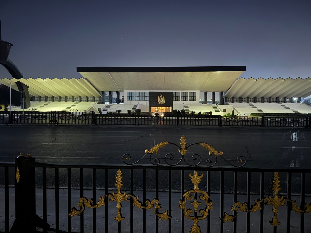 Looking across from Anwar Sadat’s grave to the site of his assassination in 1981.