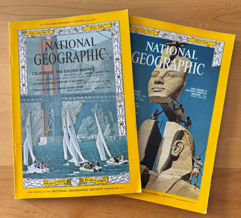 But the May 1969 issue of National Geographic was triumphant: I read another article (you are getting the idea: I love to read), “Abu Simbel’s Ancient Temples Reborn.” I wanted to go to Egypt. I had to go to Egypt. I wanted to see this with my own eyes. As the years went on, my desire to visit Egypt increased, in part because in 1976, my grandmother – she with the National Geographic magazines – visited there.