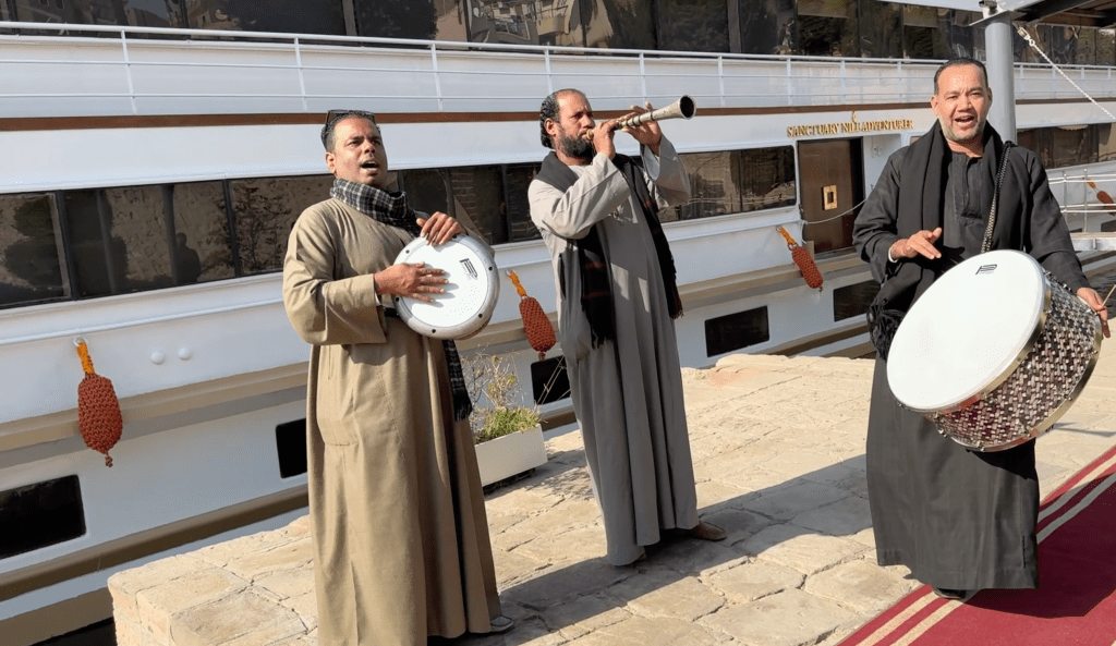 Following our visit to the Valley of the Kings and Queens, it was time to board our ship – the Sanctuary Nile Adventurer – for our cruise up the Nile. We had never been on a river cruise before and all I can say is that this particular experience was memorable beyond words. We were greeted on the dock by a group of Egyptian musicians.