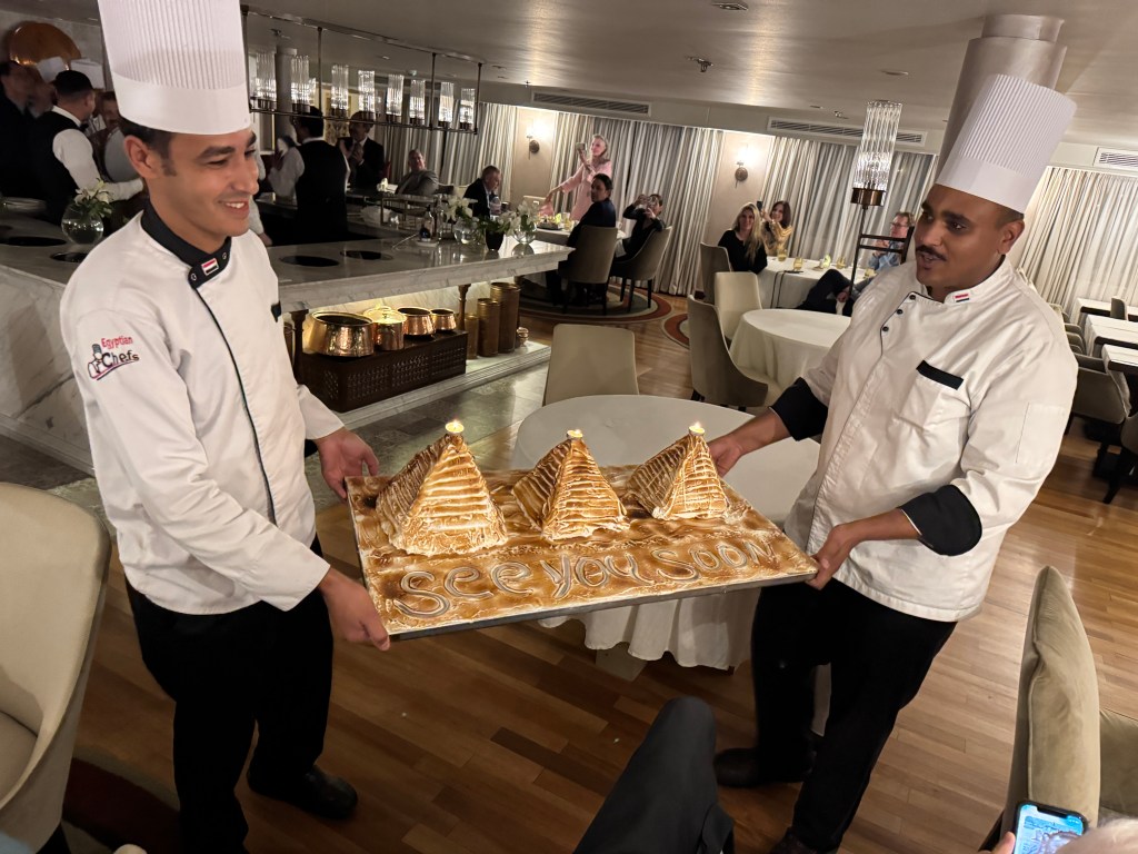 Perhaps the words written under the pyramids cakes that we enjoyed at our last dinner on the Sanctuary Nile Explorer will turn out to be a prophecy. Egypt: I hope to “See You Soon.”