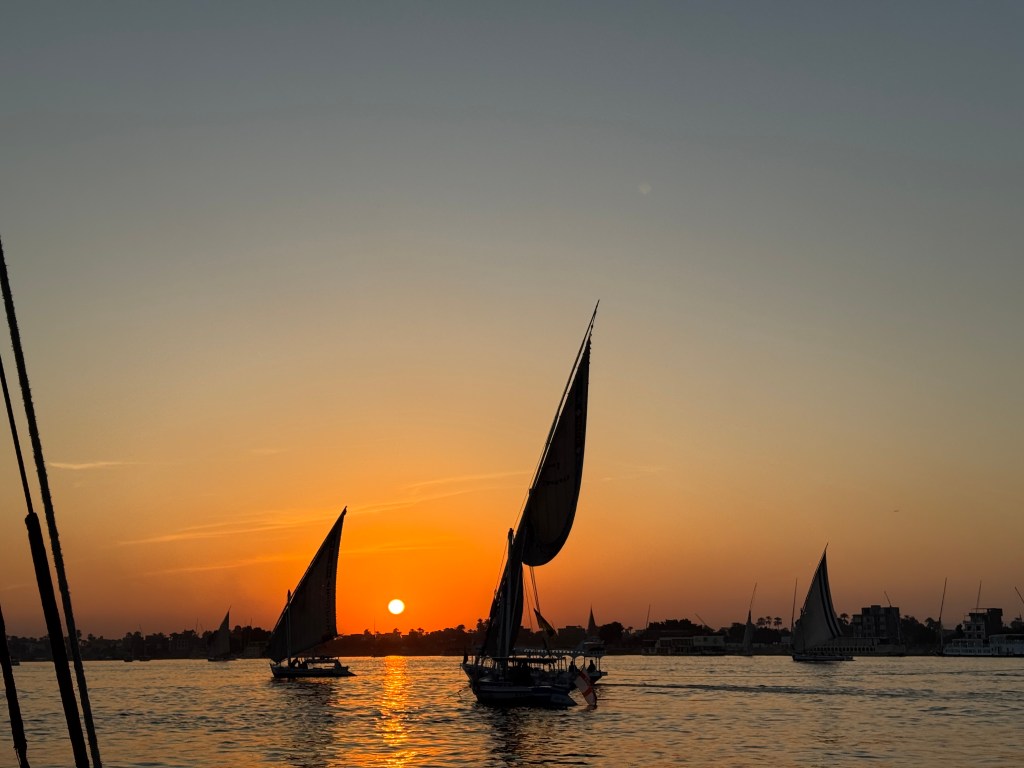 Sunset on the Nile River on the way to Luxor Temple, with felucca boats in view