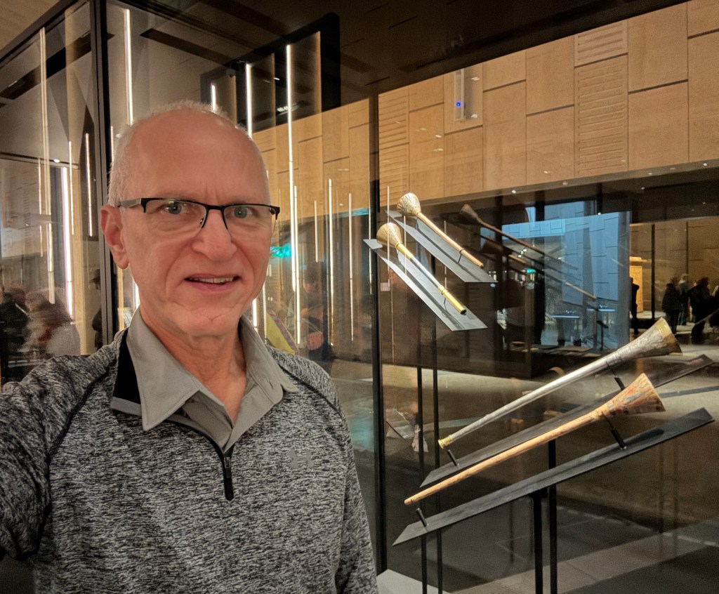 And something that was very, very important to me, the oldest surviving metal ancestors of the trombone, the two trumpets that were discovered in Tutankhamun’s tomb, along with the decorated wooden inserts that were kept inside the bells to keep them from being damaged when they were not in use: